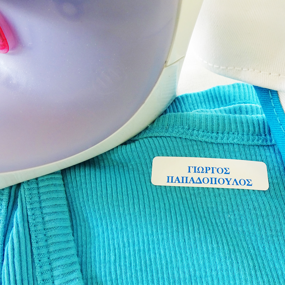Προσωποποιημένες ετικέτες ρούχων - τέλεια λύση για το παιδικό σταθμό, σχολείο, κατασκήνωση, κλπ. Ετικέτες με λευκό φόντο, κατασκευασμένες από ειδικό υλικό με υφασμάτινη υφή όπου στην πίσω μεριά τους υπάρχει μια ειδική κόλλα (Iron-On). Γρήγορο & εύκολο τρόπο εφαρμογής (είτε επικολλούνται με το σίδερο στα βαμβακερά ρούχα ή ράβονται στα υπόλοιπα υφάσματα). Aνθεκτικές στο πλυντήριο ρούχων (θερμοκρασία 40°- 60°).Διαστάσεις: 4,6 x 1,2εκ. Συσκευασία 25 τεμαχίων. Επιλέξτε χρώμα κειμένου, σχέδιο και καταχωρήσετε το επιθυμητό κείμενο (2 γραμμές - η κάθε μία έως 20 χαρακτήρες).