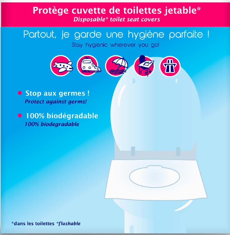 Mεγάλο μέγεθος, έτσι ώστε να επιτρέπουν στα παιδιά να μπορούν να χρησιμοποιούν δημόσιες τουαλέτες. Τα καλύμματα μιας χρήσης είναι τοποθετημένα σε αεροστεγή πρακτική θήκη για ακόμα μεγαλύτερη άνεση. Χάρη στις μικρές διαστάσεις της θήκης, χωράει στην τσάντα, στο σακίδιο ή στην τσέπη, για γρήγορη και εύκολη πρόσβαση. Η συσκευασία περιέχει 10 τεμάχια διπλωμένα ξεχωριστά σε επανασφραγιζόμενη θήκη.