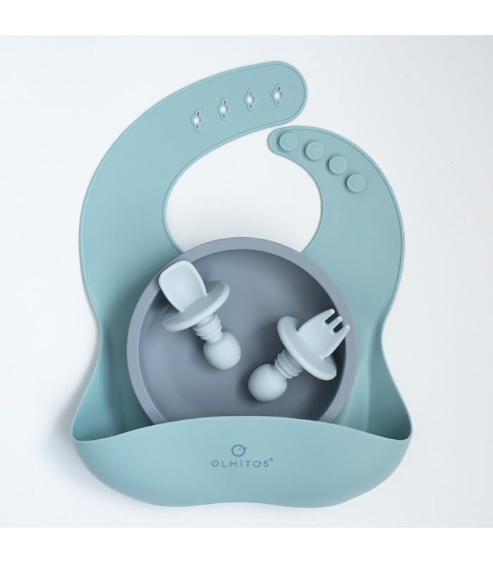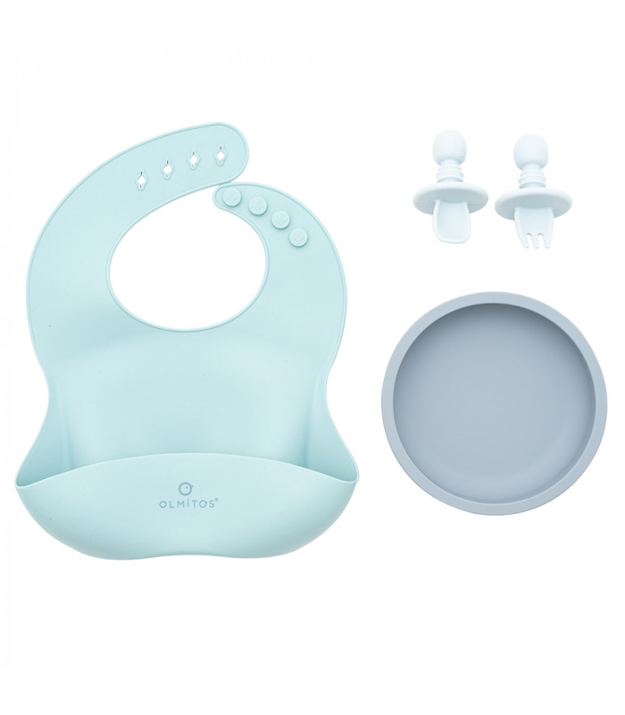 Σετ φαγητού από σιλικόνη τροφής ιδανικό για την έναρξη στερεών τροφών. Αποτελείται από μαλακή ποδιά, πιάτο με βεντούζα και μικρά μαχαιροπίρουνα με ανατομικό σχήμα για να μάθει το μωρό να τα χρησιμοποιεί.
