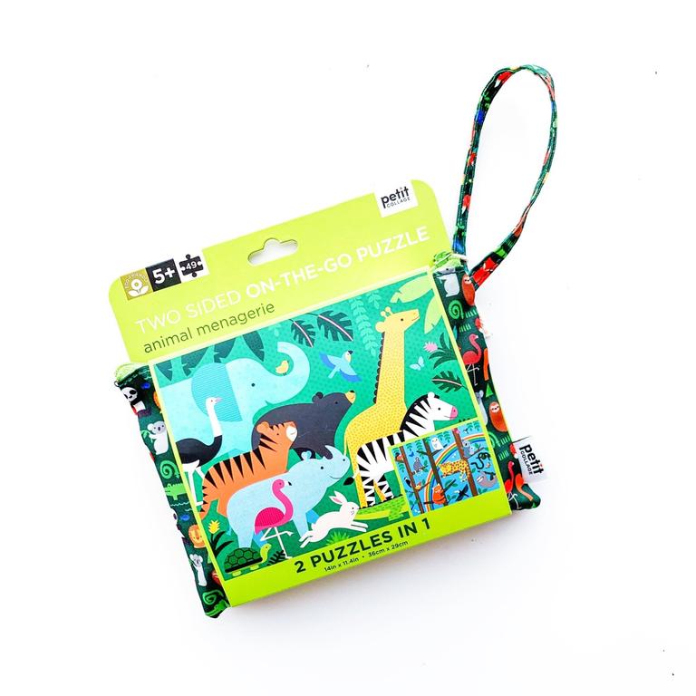 Piece together this Animal Menagerie On The Go Puzzle from Petit Collage and see how many jungle animals you can spot! This charming 100-piece puzzle is two-sided, featuring two unique designs with more friendly animals for double the fun! The portable design makes it ideal to take along on trips short and long.