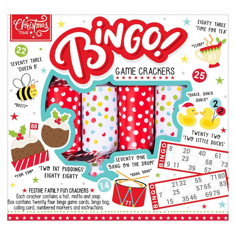 Each cracker measures 20,5cm x 4 cm and includes a hat, motto and snap. Box contains 24 bingo game cards, bingo bag, calling card, numbered markers and instructions.